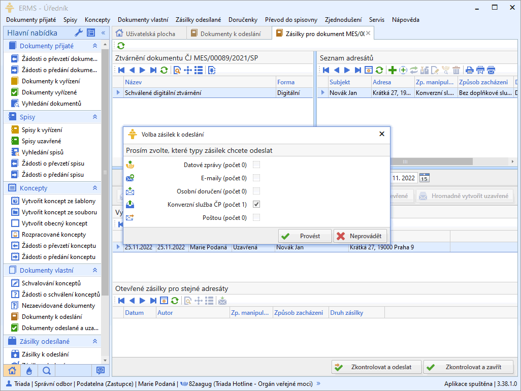Doručování pak probíhá stejně, jako kdyby adresát datovou schránku měl. K doručování se využije speciální datová schránka České pošty, kterou obsluhuje automat zachovávající listovní tajemství a umožňující automatickou autorizovanou konverzi do listinné podoby. A protože výstup z autorizované konverze dokumentů má ze zákona stejné právní účinky jako vstup, dostává adresát zabalenou listovní zásilku stejné právní váhy, jako v případě, že byste ji vytiskli, podepsali, zabalili a donesli na poštu sami. Nic z toho ale dělat nemusíte. Stačí jen odkliknout tlačítko „Provést“, jak ukazuje Obr. 2.