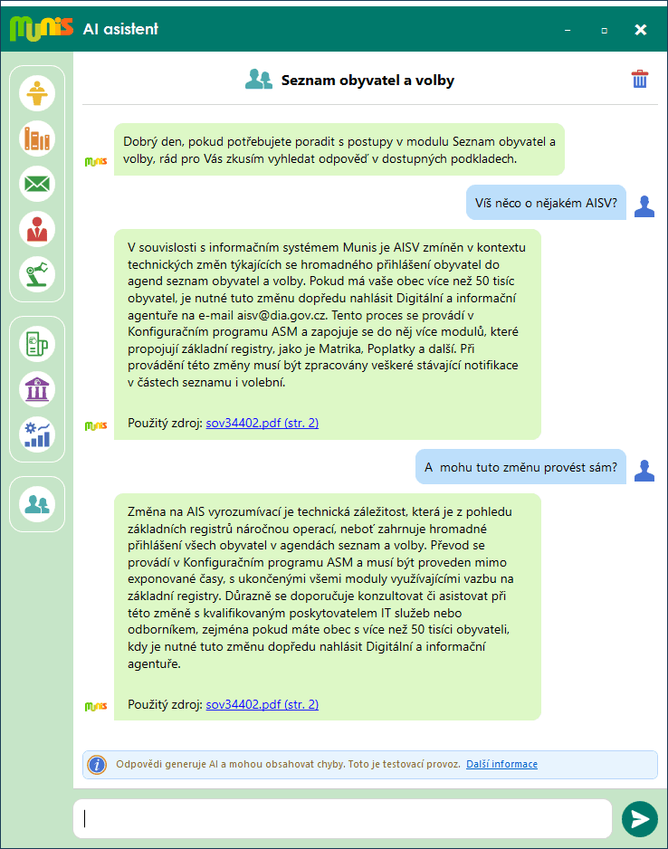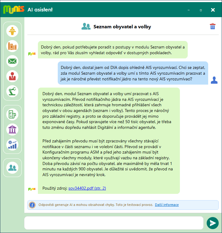 Pojďme si to ukázat na konkrétním příkladu. V nedávné době dostali téměř všichni uživatelé modulu Seznam obyvatel a volby dopis od Digitální a informační agentury, který se zmiňoval o novém způsobu notifikací v podobě AIS vyrozumívací. Protože to je technická a velmi složitá věc, bude nejlepší poradit se s Munis AI asistentem, zda o tomto AIS vyrozumívacím něco neví a neporadí nám, jak bychom ho měli využívat. Na Obr. 2 je vidět reálná komunikace mezi uživatelem a Munis AI asistentem, který v případě dotazu na AIS vyrozumívací poradil zcela přesně.