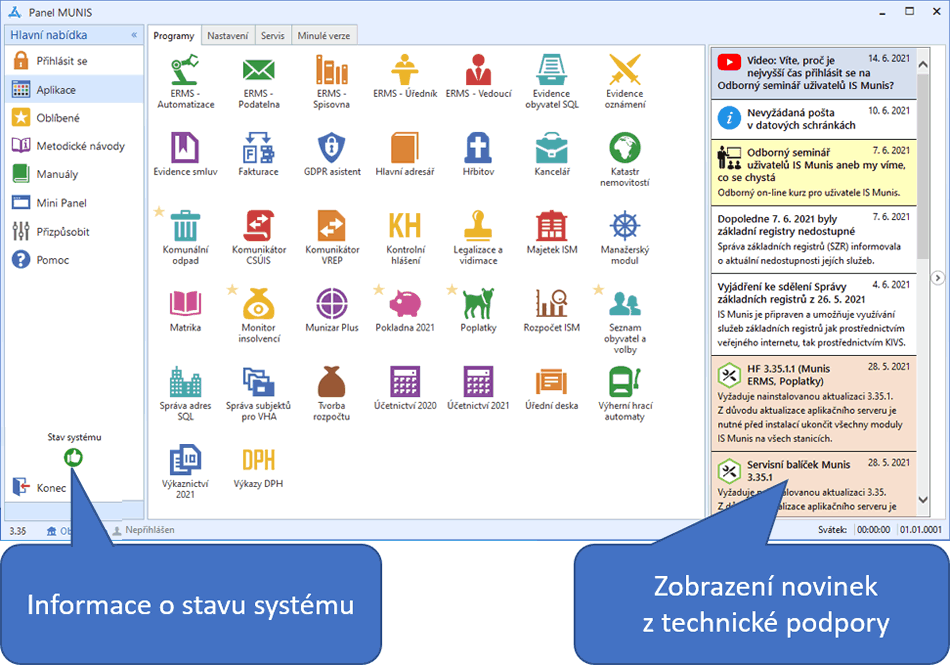 Druhou novinkou v Panelu Munis bude graficky přehlednější zobrazení novinek z technické podpory. Ukázka obou vylepšení této vstupní brány do IS Munis je na Obr. 1.