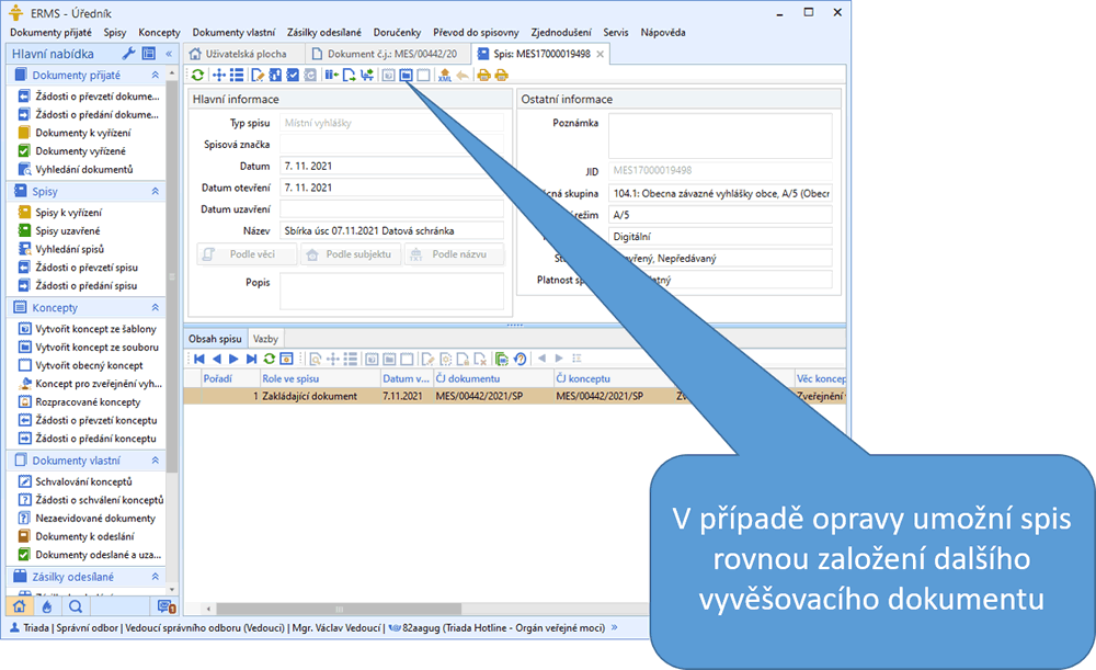 - Vedení speciálního spisu pro každé vyvěšení předpisu. Díky tomu najdete vždy na jednom místě jak dokument, kterým jste předpis vyvěsili do Sbírky, tak potvrzovací odpověď, kterou Sbírka pošle do vaší datové schránky.