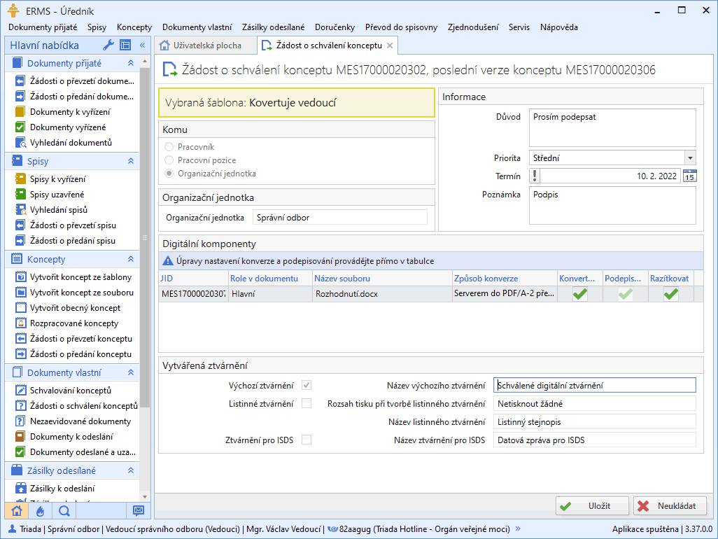 Pokud používáte v elektronické spisové službě Munis ERMS schvalovací procesy nastavené s konverzí do výstupního datového formátu PDF/A (viz Obr. 1) a tvoříte koncepty v nějakém textovém editoru, ideálně jako koncept ze šablony, pak je tato povinnost vždy automaticky splněna. Problém by nastal jen v případě, kdybyste koncept vytvořili tak, že vložíte naskenovaný text nikoliv jako text, ale jen jako obrázek. Pak by se neměla textová vrstva z čeho vytvořit.