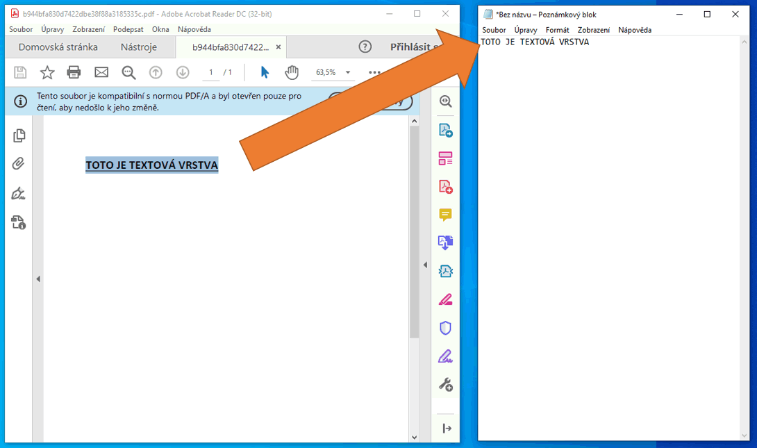 U jakéhokoliv elektronického dokumentu ve formátu PDF/A si můžete ověřit existenci textové vrstvy jednoduchým testem tak, že označíte určitou část textu a zkopírujete ji např. do poznámkového bloku. Pokud se text správně přenese, je textová vrstva v dokumentu v pořádku. Pokud se nepřenese nic, tak tam textová vrstva chybí a dokument se chová jako obrázek, což je nově nepřípustné.