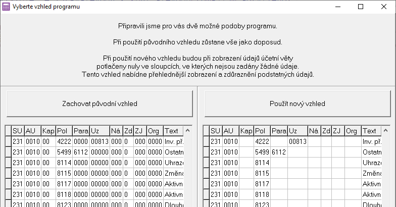 V novoroční aktualizaci je tradičně věnován větší prostor ekonomickým modulům a nejinak je tomu i letos. Jednou z výrazných novinek společných pro všechny pohledy na kontace a předkontace v Účetnictví i dalších ekonomických modulech je potlačení zobrazení nulových polí. Tuto novinku jsme sice již představili na odborných seminářích uživatelů Munis, avšak nyní se připomene všem uživatelům hned při startu programu Účetnictví 2024 – sami si tak můžete porovnat rozdíl jednotlivých zobrazení a vybrat si takové, které vám bude vyhovovat nejvíc (viz Obr. 1). Svou volbu můžete samozřejmě následně kdykoliv přehodnotit a změnit.