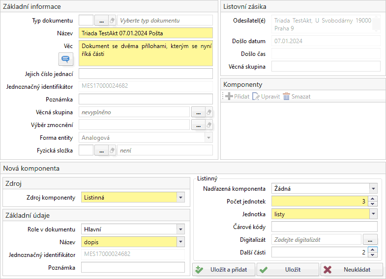 V souvislosti se změnami legislativy v oblasti spisové služby, které se mají během následujících dvou let postupně aplikovat v praxi, jsme v elektronické spisové službě Munis ERMS upravili možnosti zápisu listovního podání. Tyto úpravy zjednodušují popis přijatého listinného dokumentu, protože již neexistuje povinnost počítat listy u příloh a analogové přílohy stačí nově zapsat jejich počtem. Těmto přílohám se podle novelizované vyhlášky č. 259/2012 Sb. říká „části“. Zohlednění uvedených změn je ilustrováno na Obr. 3 – přímo u zápisu hlavní komponenty (kde listy počítat musíme) zde lze přidat počet dalších analogových částí.