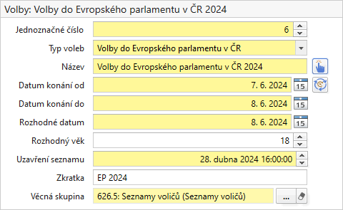 Následně použijte položku Aktuální volby z nabídky a v ní tlačítkem „Plus“ založte volby do Evropského parlamentu podle vzoru na Obr. 1. Po založení voleb pokračujte vytvořením volebního seznamu.