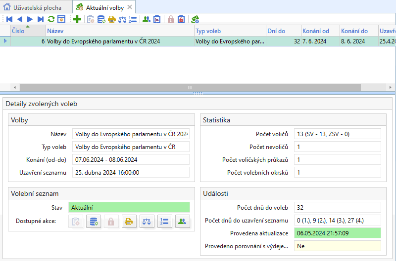 V modulu Seznam obyvatel a volby byl pro účely příprav na volby do Evropského parlamentu zpřehledněn formulář „Aktuální volby“ tak, aby zobrazoval informace o všech fázích přípravy volebního seznamu – viz Obr. 1. V této souvislosti byla také rozšířena nabídka tiskových sestav a upraveny byly i některé specifické procesy pro jednotlivé fáze přípravy volebního seznamu.