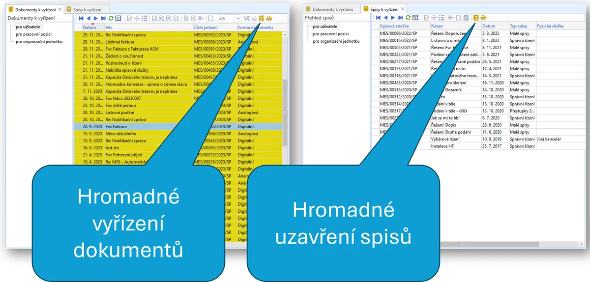 Podmínkou elektronického skartačního řízení je kvalitní vedení spisové služby zahrnující vyřizování dokumentů a uzavírání spisů. Bez toho to opravdu nepůjde. Určitě proto začněte tím, že prověříte, že máte všude, kde je třeba, vyznačené vyřízení dokumentů a uzavření spisů. Pokud zjistíte nějaké resty, elektronická spisová služba Munis ERMS vám je pomůže zvládnout. Nabízí totiž mnoho hromadných procesů – viz obr. 1.