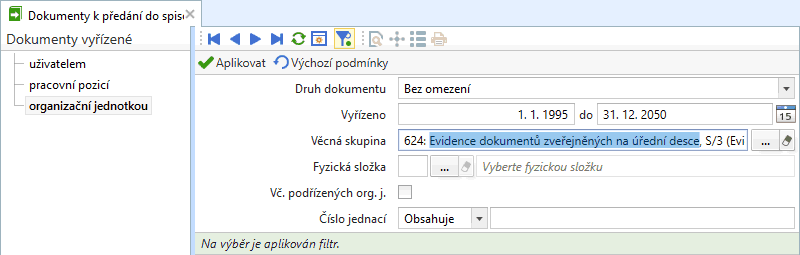 Pokud se chystáte na své první elektronické skartační řízení, nesnažte se si ukousnout moc velký krajíc najednou. Je vždy lepší začít od menších jasnějších celků. Vyberte si vhodnou věcnou skupinu, např. „Evidence dokumentů zveřejněných na úřední desce“, která je typickou „eskovou“ věcnou skupinou – tedy takovou věcnou skupinou, která je navrhována ke skartaci. Vyhledejte všechny dokumenty, jež máte k tomuto tématu vyřízené ve spisové službě a přeneste je do spisovny (ukázka tohoto výběru je na Obr. 2).