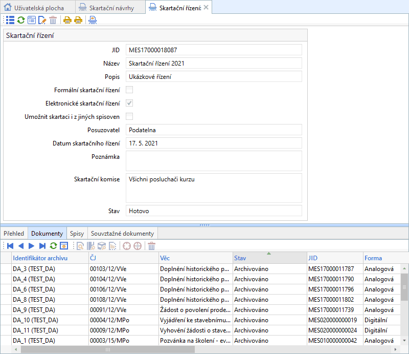 Jakmile je odsouhlasen skartační návrh a vy získáte povolení ke skartaci, stačí jen v elektronické spisové službě tuto odpověď načíst a aplikovat. Dokumenty se samy označí za smazané. Jejich digitální obsah je odstraněn a v evidenci zbyde jen tzv. hlavička metadat informující o tom, že dokumenty v evidenci byly.
