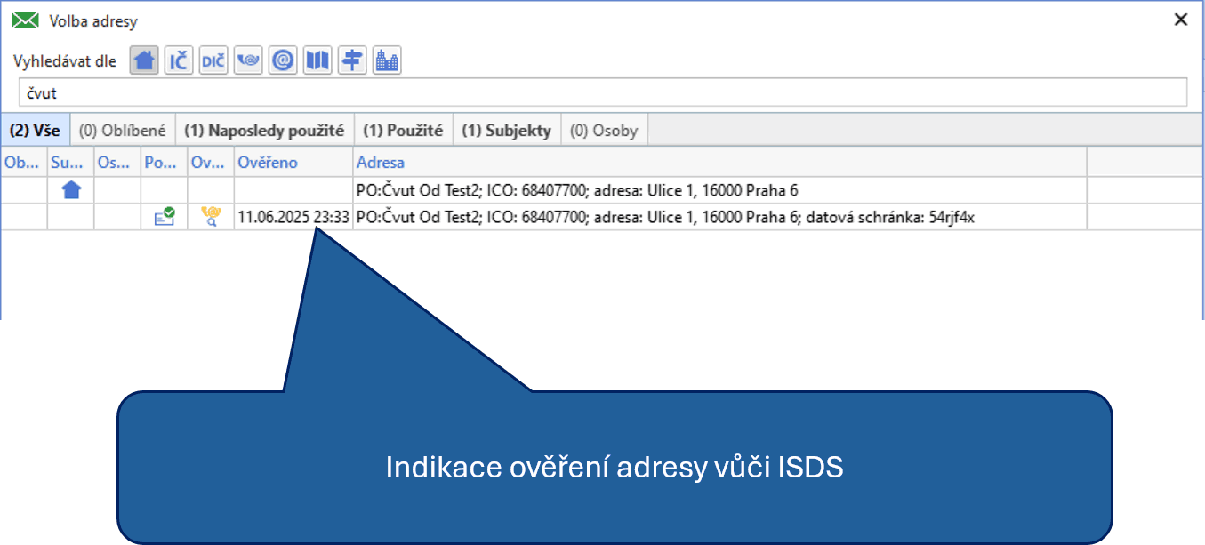 Jedním z dlouhodobých problémů vedení spisové služby je zajištění čistoty a přehlednosti hlavního adresáře, který je legislativou nazýván jmenný rejstřík. V elektronické spisové službě Munis ERMS jsme před mnoha lety zvolili hierarchickou strukturu zápisu subjektů, která umožňuje přehledně navázat k právnickým osobám oddělení či k podnikatelům asistentky a asistenty. Můžete tak evidovat různé pobočky závodů anebo kontaktní osoby. Všechny tyto údaje většinou nejsou vedeny v centralizovaných registrech, a proto jsou vaším doplňkem k ověřeným údajům načteným z datových schránek nebo základních registrů. Nicméně tato volnost evidence často přináší zaplevelení hlavního adresáře různými duplicitami a nepřesnostmi, které pak ztěžují orientaci a výběr konkrétních podatelů. Proto jsme v rámci zmíněné aktualizace přistoupili k různým procesům ověřování a samočištění. Obr. 1. ilustruje indikaci ověření adresy vůči ISDS.