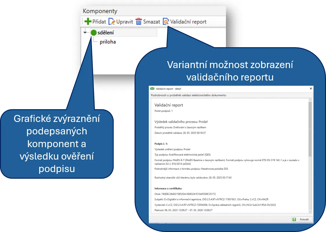 Ověřování elektronických podpisů je spojené se stále se opakujícími otázkami, které jsou způsobeny zejména legislativou komplikovaně nastavenými pravidly. Musíte rozlišovat mezi zaručeným elektronickým podpisem, uznávaným elektronickým podpisem a kvalifikovaným elektronickým podpisem a přitom vědět, kdy který stačí k tomu, abychom považovali přijatý dokument za podepsaný. Ověřování jsme se pokusili co nejvíce automatizovat a zjednodušit. Pokud je komponenta přijatého dokumentu podepsaná, objeví se u ní automaticky barevný puntík.