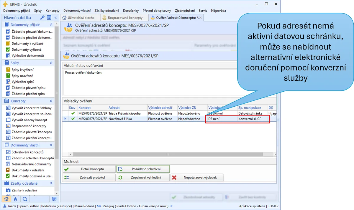 Konverzní služba České poštu funguje stejně jako doručení do datové schránky, a dokonce je i tímto způsobem technicky řešena. Jak ilustruje Obr. 1, v případě, kdy povaha dokumentu umožňuje doručení do datové schránky, ale adresát datovou schránku nemá, nabídne elektronická spisová služba automaticky doručení prostřednictvím konverzní služby České pošty. Podmínkou je, že máte uzavřenou příslušnou smlouvu s Českou poštou a nastavenou spisovou službu na tuto vazbu.