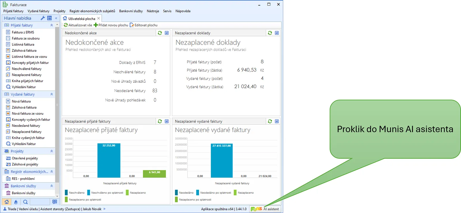 Munis AI asistent je v modulech Fakturace ASM, Bankovní služby ASM, v elektronické spisové službě Munis ERMS a v modulu Seznam obyvatel a volby dostupný vždy v pravé spodní části okna aplikace. Prokliknete se do něj prostřednictvím tlačítka uvedeného na Obr. 1.
