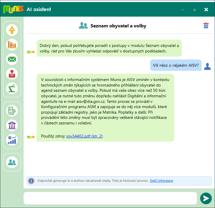Pojďme si to ukázat na konkrétním příkladu. V nedávné době dostali téměř všichni uživatelé modulu Seznam obyvatel a volby dopis od Digitální a informační agentury, který se zmiňoval o novém způsobu notifikací v podobě AIS vyrozumívací. Protože to je technická a velmi složitá věc, bude nejlepší poradit se s Munis AI asistentem, zda o tomto AIS vyrozumívacím něco neví a neporadí nám, jak bychom ho měli využívat. Na Obr. 2 je vidět reálná komunikace mezi uživatelem a Munis AI asistentem, který v případě dotazu na AIS vyrozumívací poradil zcela přesně.