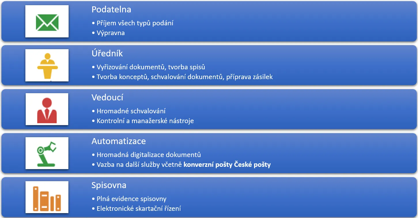 Z pohledu spisové služby je důležité, aby byla zajištěna vhodným a spolehlivým elektronickým systémem spisové služby, protože jednou ze změn, které jsou svázány s koncem tohoto roku, je povinnost vést elektronickou spisovou službu pro všechny původce. Ani ty nejmenší obce ani školy nemají z této povinnosti žádnou výjimku. Elektronická spisová služba Munis ERMS je právě takovým nástrojem, který je díky variabilitě nastavení vhodný jak pro města a obce, tak pro jimi zřizované organizace včetně škol.