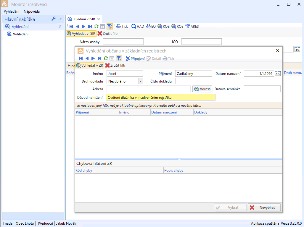 - vyhledávání v insolvenčním rejstříku podle podmínek z ověřených zdrojů,
