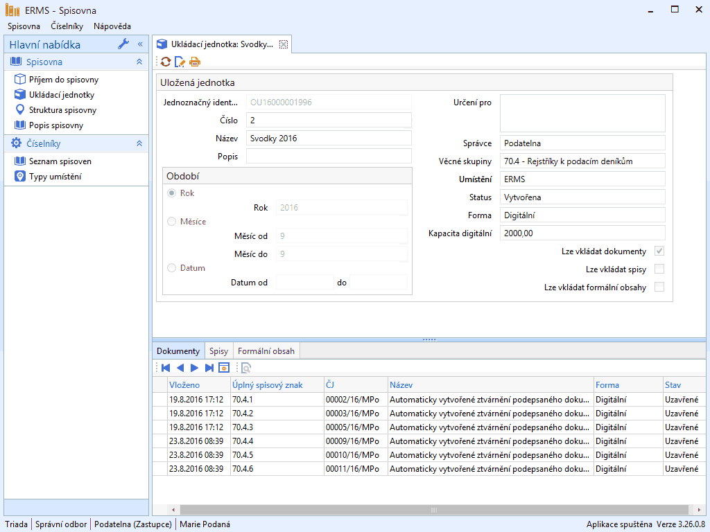 Základem evidence v aplikaci Spisovna je ukládací jednotka, která může obsahovat dokumenty, spisy a tzv. formální obsah (viz Obr. 1). Dokumenty, které nejsou součástí spisů, a spisy včetně všech do nich vložených dokumentů vstupují do spisovny výhradně z primární evidence vedené v elektronickém systému spisové služby. Pokud v rámci IS Munis vznikají anebo jsou evidovány další dokumenty, jsou různými vazbami přímo zaevidovány také v Munis ERMS, odkud se pak dostávají do spisovny. V rámci přenosu do spisovny jsou prováděny formální kontroly úplnosti metadat, která je podstatná zejména pro déle trvající spisy, jež mohou obsahovat dokumenty vzniklé i před vlastní působností zákona o archivnictví a spisové službě, dále formátové a další specifické kontroly (viz též Obr. 2).