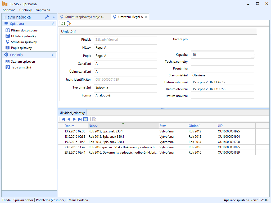V aplikaci spisovna lze souběžně evidovat více spisoven. Každá z nich má svou vlastní strukturu, jejíž složitost závisí na realitě původce. Tato struktura je hierarchická a popisuje různá umístění, kde mohou být uloženy ukládací jednotky (viz Obr. 3). Samozřejmostí je propracovaný systém přístupových práv a oprávnění zajišťující bezpečnost uložených dat.