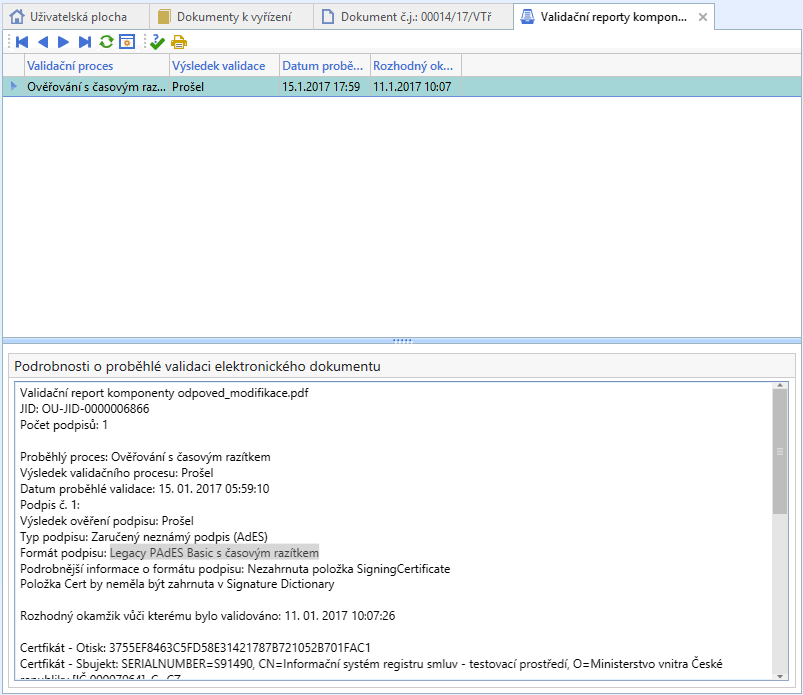Pokud ověřujeme elektronický podpis, ptáme se též na platnost certifikátu, který je s ním spojen. Pokud panuje nejistota, kdy elektronický podpis vzniknul, musíme vždy ověření platnosti vztáhnout k okamžiku, kdy elektronický dokument vstupuje do systému. Tedy, kdy je např. přijímán jako podání, nebo kdy je konvertován autorizovanou konverzí dokumentů na CzechPOINTu do listinné podoby. Je-li elektronický dokument opatřen platným časovým razítkem, můžeme ověření vztáhnout k okamžiku uvedeném v připojeném razítku (viz též Obr. 1). Znamená to, že časové razítko obecně prodlužuje ověřitelnost elektronického podpisu elektronického dokumentu. To platí již od roku 2004 a žádná ze změn právních předpisů, ani nařízení eIDAS, na tomto dobrodiní časového razítka nic nezměnilo.