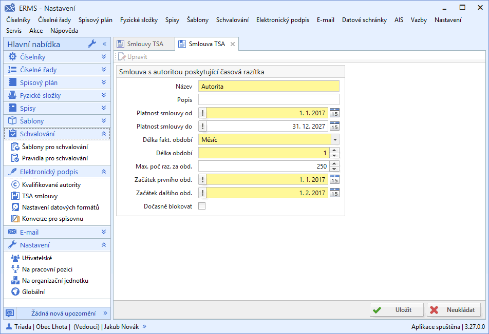 Technická úroveň je závislá na použitém systému, v němž je podepisování realizováno. Pokud pro výkon spisové služby využíváte elektronický systém spisové služby Munis ERMS, jehož tvůrcem i dodavatelem je společnost Triada, pak je technická stránka velmi jednoduchá. Základem je primární nastavení parametrů (viz též Obr. 2) a možnosti razítkování u schvalovacích procesů. Přidání kvalifikovaného časového razítka se následně stane automatickou součástí schvalovacího procesu a uživatelé změnu, kdy se k podpisu začne přidávat i časové razítko, vlastně vůbec nemusí postřehnout.