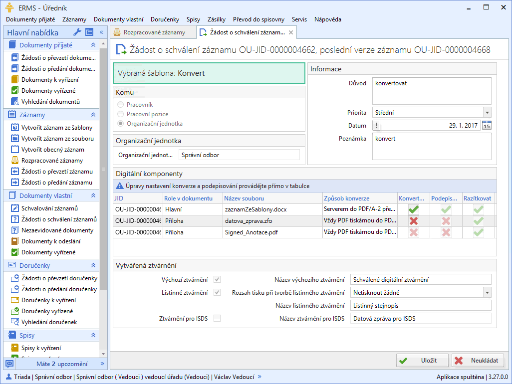 U prvního případu není vlastně, co řešit. Máme danou potřebu 365 (u přestupného roku 366) kvalifikovaných časových razítek za rok. Na druhou stranu otázka podmínky „právního jednání“ je složitější. V každém případě je splněna pro všechna vydaná správní či jiná rozhodnutí. Na druhou stranu se zřejmě nevztahuje na faktury, ale zase naopak pravděpodobně vztahuje třeba na výměry. Metodické nastavení tedy není zcela jednoduché. Nicméně jakmile dospějeme k určitým pravidlům, je jejich aplikování v případě elektronické spisové službě Munis ERMS opět velmi jednoduché. Elektronická spisová služba Munis ERMS obsahuje nastavení schvalovacích procesů, které zjednodušují a urychlují každodenní praxi tvorby elektronických dokumentů. Stačí je jednou nastavit a další aplikování je pak už automatické (viz Obr. 2).