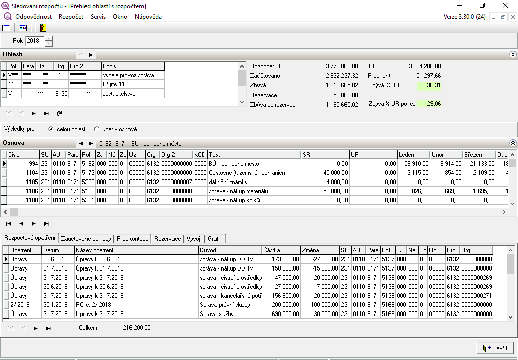 Modul Sledování rozpočtu napomáhá nejen vlastní kontrole, ale umožňuje též detailní plánování výdajů pomocí tzv. poukazů, kterými lze dopředu alokovat potřebné prostředky. Vzhledem k tomu, že je možné v modulu individuálně nastavit různé sledované oblasti (jejich příklad je uveden na obr. 1), mohou být takto podchyceny jednotlivé investiční akce a číselně i graficky sledován jejich průběh z hlediska zajištění potřebných prostředků a jejich čerpání. Pomocí jednoduché barevné legendy je na první pohled patrné, pokud se mezi plánované výdaje vybrané čísti rozpočtu vklíní neočekávaný výdaj, který by mohl ohrozit celkové alokované prostředky v dané oblasti na vybranou investiční akci. Protože kontrola probíhá nejen pro zúčtované výdaje, ale také na připravených kontací, může se tak odhalit i případná chyba volby rozpočtové položky nebo paragrafu.