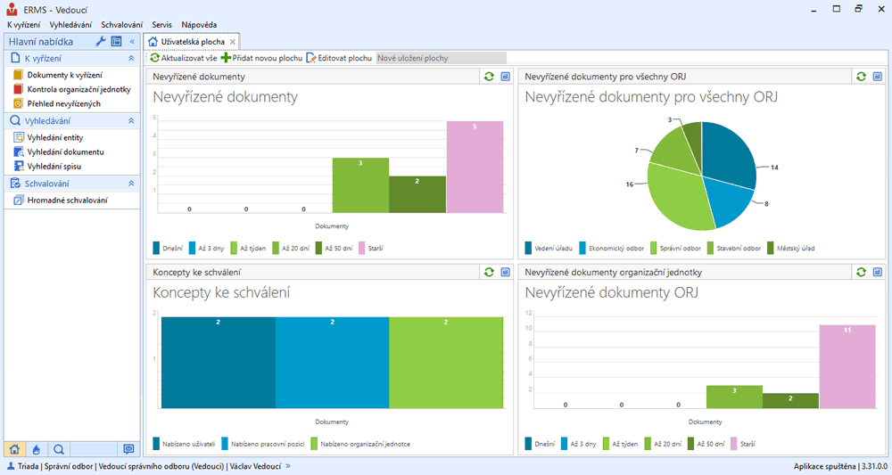 Základem přístupu aplikace ERMS Vedoucí je proto jednoduchost a přehlednost, aby dodržení popsaného principu bylo pro starosty a další vedoucí pracovníky co nejrychlejší. Primárním nástrojem tohoto modulu je tak hromadné schvalování dokumentů, které nabízí co nejvyšší komfort pro elektronické podepisování dokumentů samozřejmě s jejich nezbytnou kontrolou. V aplikaci ERMS Vedoucí lze také kontrolovat činnost úředníků (podřízených), vyhledávat dokumenty a spisy a zobrazovat různé statistiky. Jde o různé manažerské pohledy, které umožňují kontrolovat vyřizování dokumentů, uzavírání spisů a dodržování termínů.
