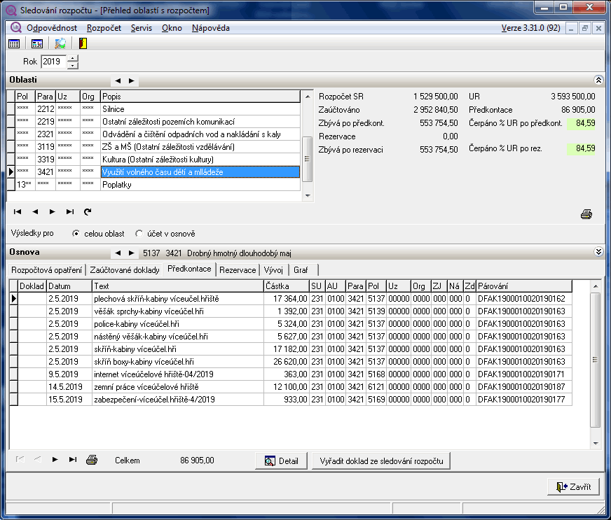 Kromě toho nabízí program souhrnný pohled na schválený a upravený rozpočet včetně jeho plnění. Pro uživatele je dále k dispozici přehled všech účetních dokladů, které s plněním rozpočtu souvisely a souvisí, a pracovníci tak mají možnost velmi rychlé a jednoduché kontroly. Z modulu Sledování rozpočtu se dají dělat grafické výstupy a jednotlivé přehledy je možné tisknout.