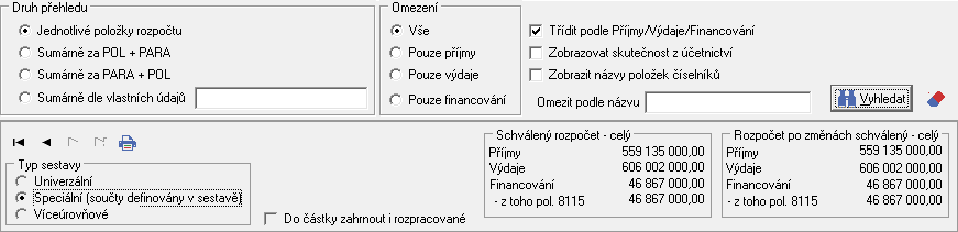 - Speciální – tyto sestavy jsou vhodné, pokud vám nevyhovují úrovně součtů nebo grafická podoba sestav univerzálních. Je zde připravena typická sestava tříděná a součtovaná podle třídy, paragrafu a položky. Pokud potřebujete jinou grafickou úpravu, vytvořete si kopii této sestavy a upravte dle potřeby. Pro různá třídění a součtování ale budete nejspíš potřebovat samostatné sestavy.