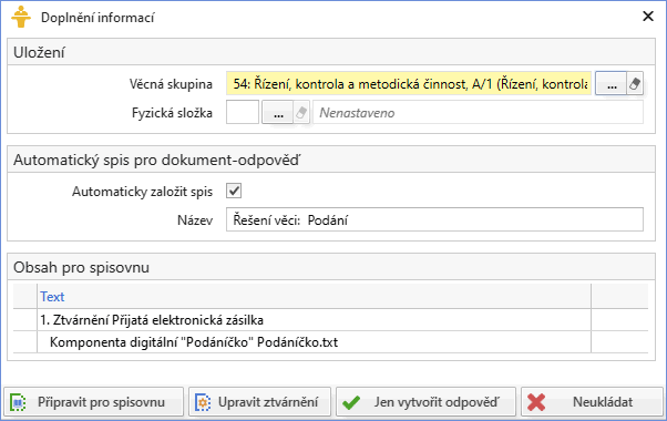Automatická tvorba spisu značně zjednoduší naplnění dikce zákona a zajistí, že oba dokumenty, jak přijaté podání, tak posléze vytvořená odpověď, budou vloženy do spisu s odpovídajícím popisem a odpovídajícím zatříděním. Jediný rozdíl oproti původnímu způsobu práce je pak v tom, že odesláním odpovědi vyřizování nekončí, ale je třeba spis ještě uzavřít.