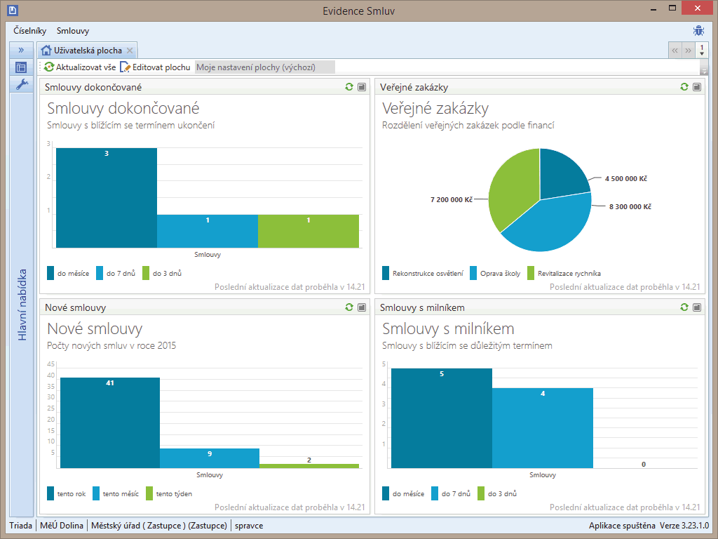Každý termín spojený se smlouvou, ať již vychází z doby platnosti smlouvy anebo z nastavených milníků, program připomíná několika různými způsoby. Jedním z nich je vstupní pracovní plocha, kde lze nastavit příslušné textové i grafické informace, Dalším způsobem je posílání e-mailových notifikací. Informace se tak k vám dostane, aniž modul Evidence smluv spustíte.