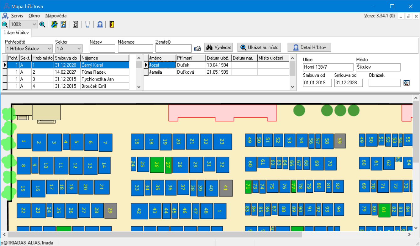 Ve spolupráci s modulem Mapa hřbitova je možné jedním kliknutím zobrazit v plánku hřbitova vybrané hrobové místo.